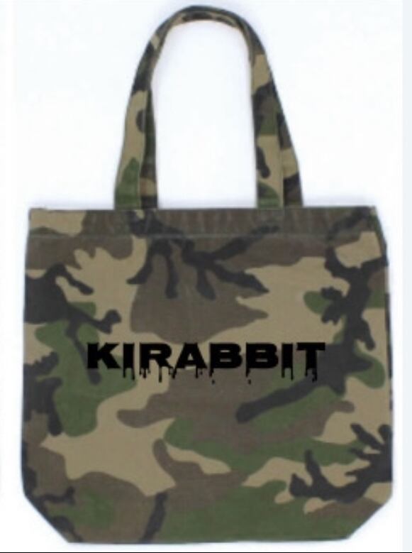 A stylish and functional KIRABBIT tote bag featuring an eye-catching camouflage pattern!