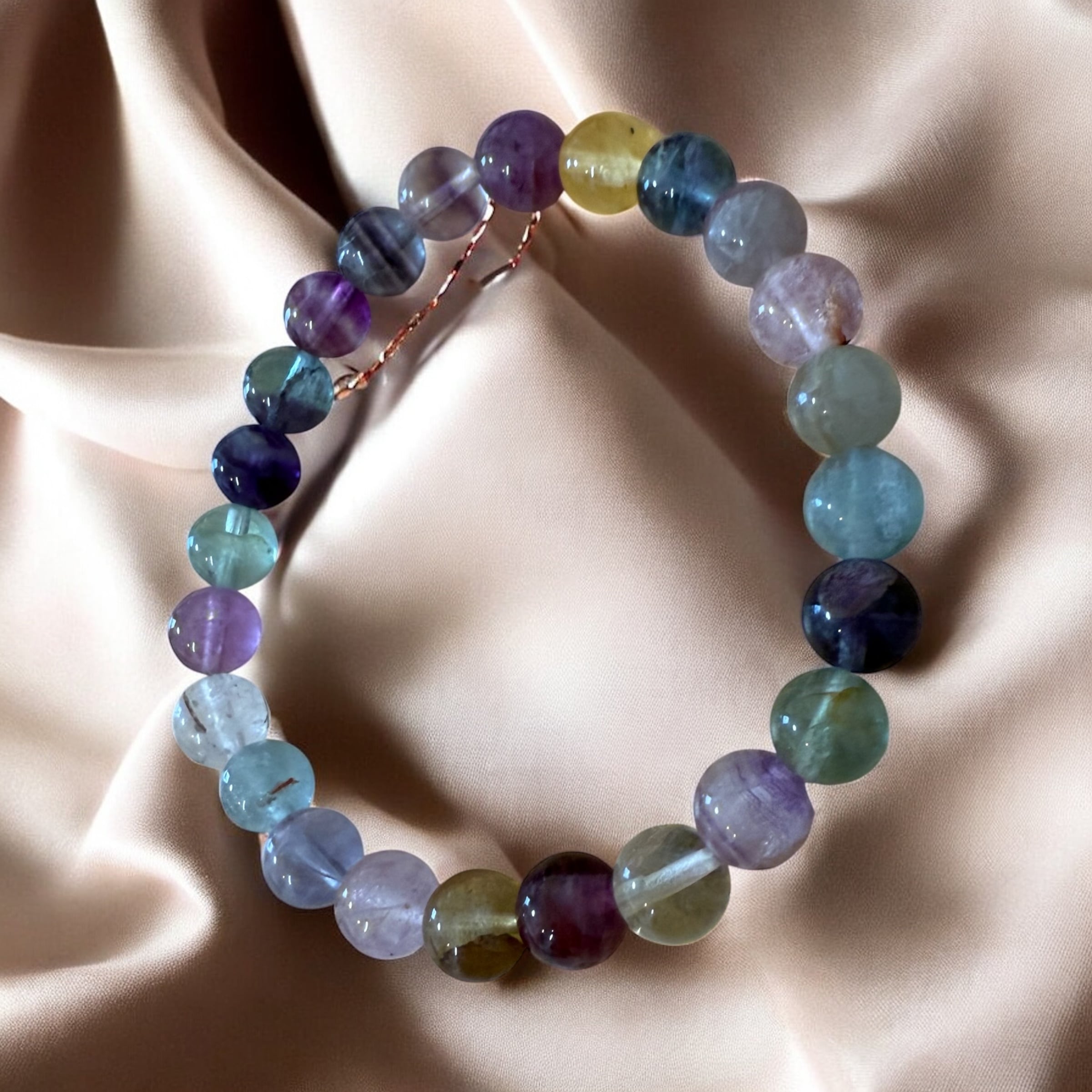新登場の♦️天然石フローライト♦️パワートーンブレスレットは、その魅力的な色合いが目を引く特別なアイテムです。このブレスレットは、直感力を高め、心のクリアリングを促進することで、あなたの思考をよりクリアにし、集中力を向上させる効果が期待されています。